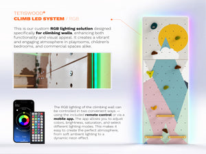 The TetisWood® Climb LED System RGB is a custom-designed lighting solution created specifically for climbing walls. It enhances both functionality and visual appeal, transforming any climbing space into a vibrant and engaging environment. Ideal for children’s rooms, playrooms, gyms, and commercial spaces, this system adds a modern and dynamic touch to your climbing wall.